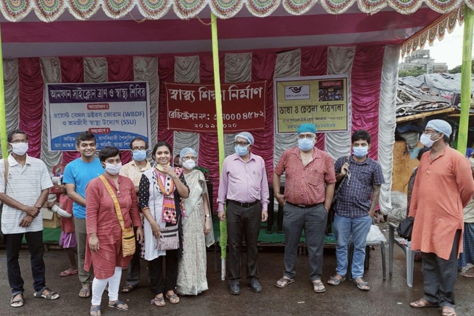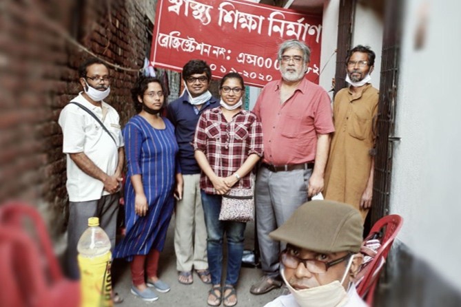 "স্বাস্থ্য শিক্ষা নির্মাণ" তৈরি হয় ২০১৯ নাগাদ। প্রথমে নৈহাটির বন্ধ জুট মিল এলাকার একটি শ্রমিক বস্তিতে আমরা সাপ্তাহিক ক্লিনিক শুরু করার সিদ্ধান্ত নিই। স্থানীয় একটি ক্লাবের এক ফালি বারান্দায় আমাদের প্রথম ক্লিনিক শুরু হয়। ২০২০ অতিমারীর সময়ে আমরা ওই এলাকার মানুষদের পাশে দাঁড়ানোর চেষ্টা করেছি । যে সময় সমস্ত চিকিৎসা কেন্দ্র বন্ধ, মানুষ বাইরে বের হচ্ছে না, সেরকম সময় কোভিদ বিধি মেনে নিয়মিত ক্লিনিক চালিয়েছি আমরা। এলাকার মানুষদেরকে প্রতিদিনের জীবনযাত্রায় সহায়তার জন্য নানা ত্রাণ সামগ্রী দিয়ে তাদেরকে সচল রাখার চেষ্টা করা হয়েছিল। সেই পর্যায়ে আমাদের টিমের ছবি এটি।